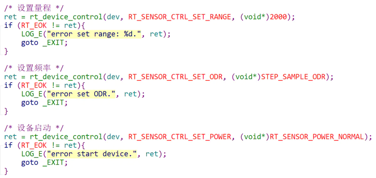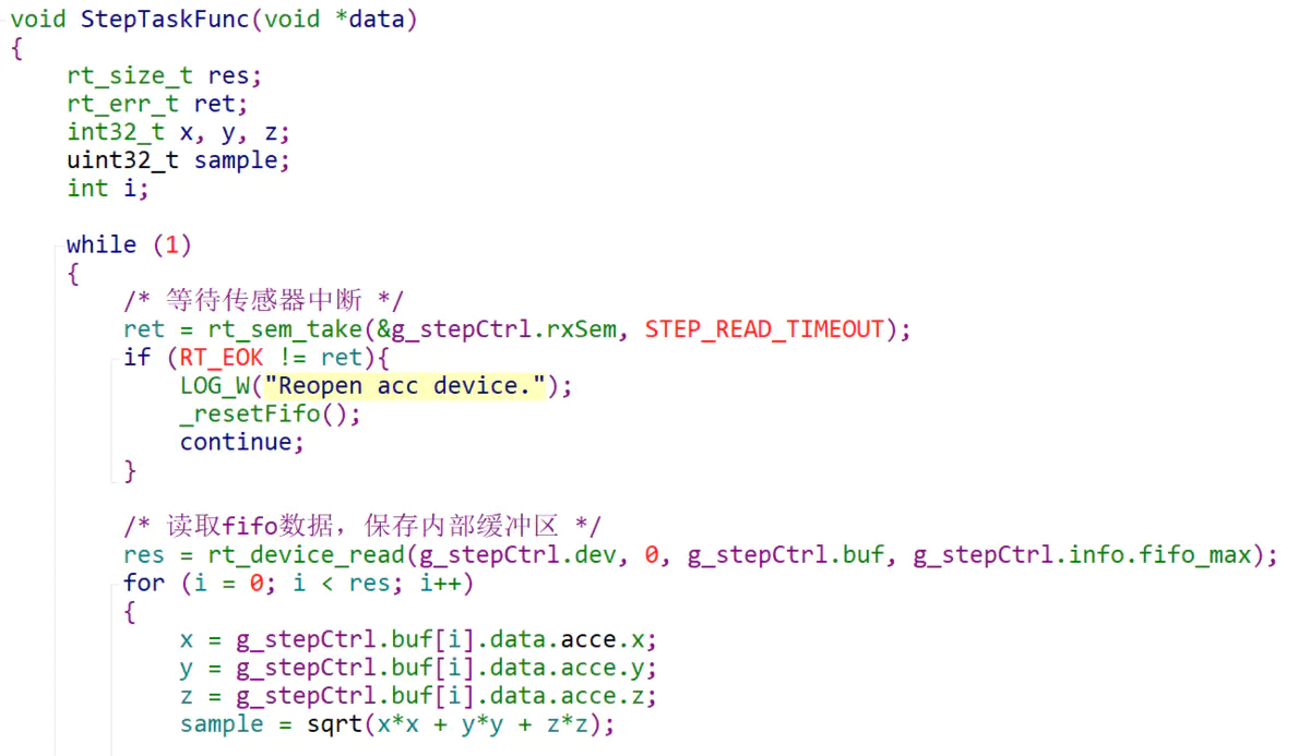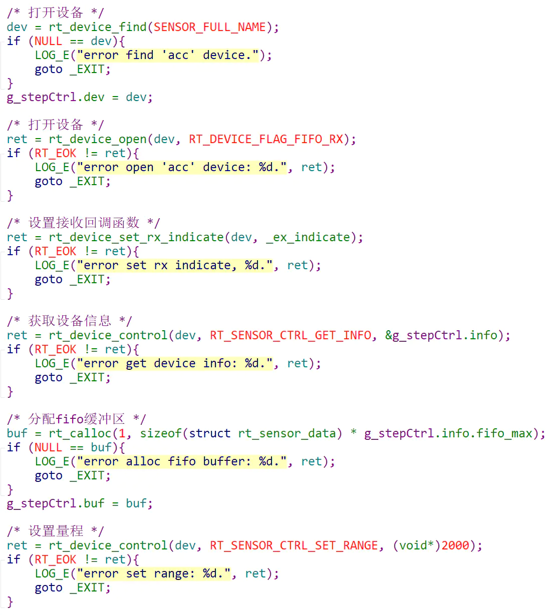 RT-Thread Sensor框架的官方文档中有一个“传感器使用 FIFO 接收模式并配合接收回调函数的使用示例”可以参考。我们实际使用的代码采用了获取设备、设置接收回调、读取设备信息、分配数据缓冲区、设置量程、设置采样频率、启动设备的流程。并在读取数据失败的时候增加了重置FIFO的代码,避免因调试或数据传输阻塞导致的硬件FIFO溢出停止更新的问题。