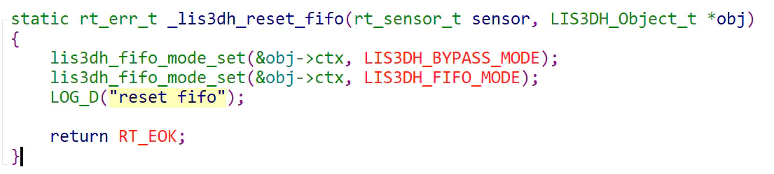 LIS3DH芯片的FIFO支持两种模式:一种Steam模式,读取不及时时芯片会丢弃最老的数据,保留最新的数据;一种是FIFO模式,读取不及时芯片会停止更新FIFO。我们的系统需要连续的获取传感器数据,不希望丢失数据因此使用FIFO模式。但是为了避免因为调试或数据传输阻塞等情况造成的FIFO停止更新的情况,增加了一个自定义命令RT_SENSOR_CTRL_RESET_FIFO,用于在读取不到数据时重置FIFO恢复正常的数据更新。