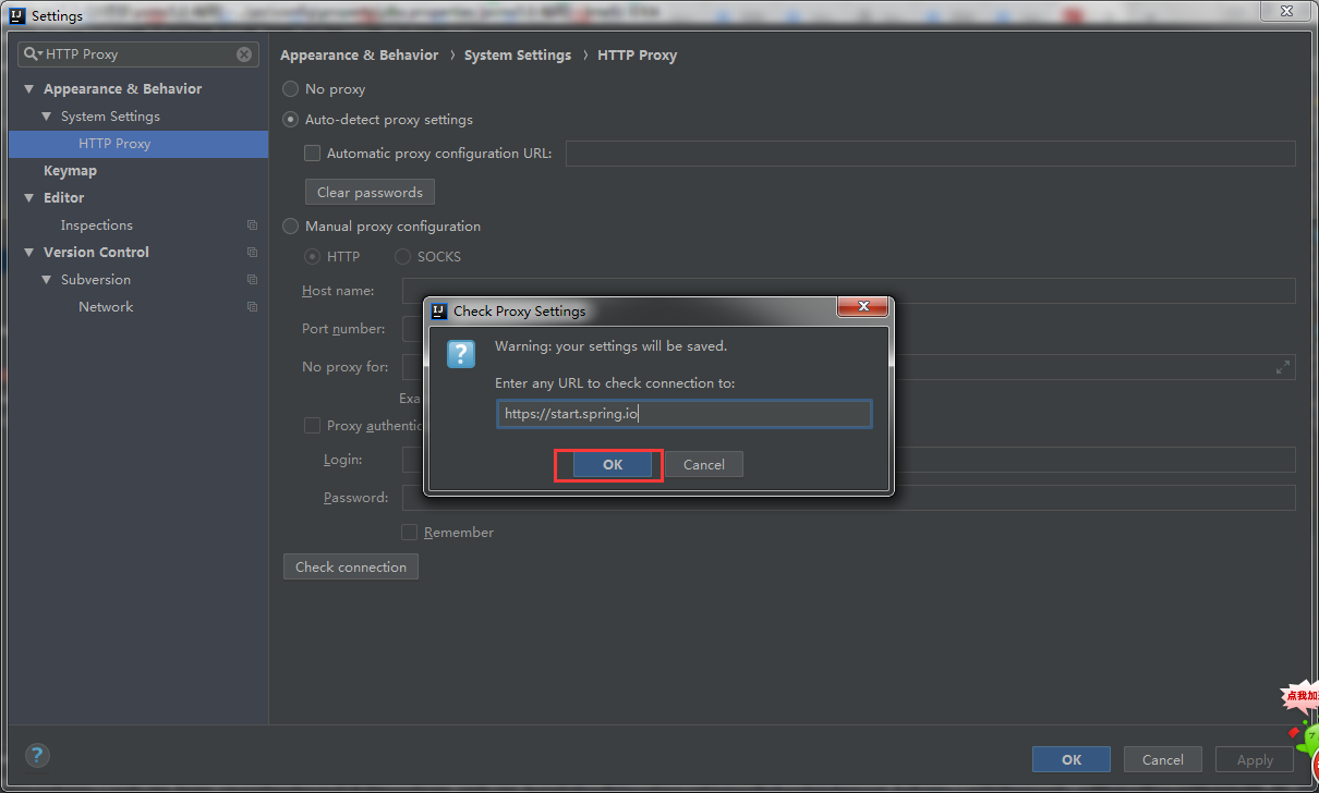 点击最下面的Check connection弹出如下的输入框,输入地址https://start.spring.io点击ok,如果successful证明连接成功,(如果successful没有出现,多尝试几次只要通一次就可以了,表明网站可以连通)重新生成一次,完美生成springboot项目