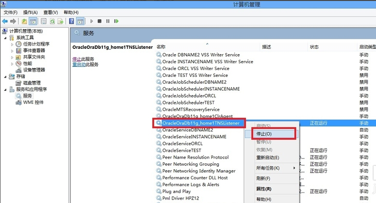 进入计算机管理,在服务中,找到oracle开头的所有服务,右击选择停止
