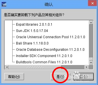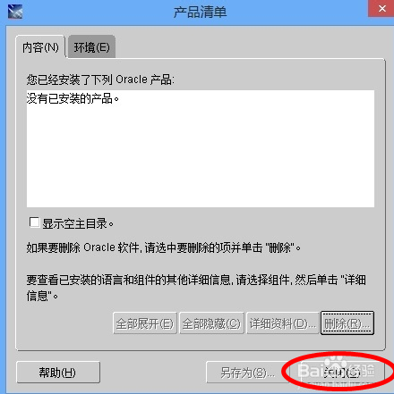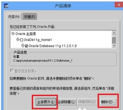 3、在产品清单窗口中,单击全部展开,除了OraDb11g_home1外,勾选其他项目,单击删除