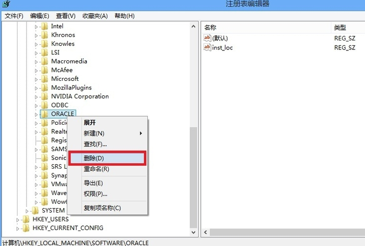4、按Windows徽标键和R键,打开运行窗口,输入regedit,打开注册表,依次展开HKEY_LOCAL_MACHINE\SOFTWARE,找到oracle,删除之