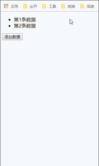 <!DOCTYPE html><html lang="en"><head> <meta charset="UTF-8"> <meta name="viewport"content="width=device-width,initial-scale=1.0,maximum-scale=1.0,user-scalable=no"> <meta http-equiv="X-UA-Compatible"content="ie=edge"> <title>Vue 代码演示</title></head><body> <div id="app"> <ul> <!--根据数组数据自动渲染页面--> <li v-for="item in message">{{item}}</li> </ul> <button @click="add">添加数据</button> </div> < src="https://cdn.jsdelivr.net/npm/vue/dist/vue.js"></> <> new Vue({ el: "#app", data: { message: ["第1条数据", "第2条数据"], i: 2 }, methods:{ //向数组添加一条数据即可 add:function(){ this.i++; this.message.push("第"+ this.i + "条数据"); } } }) </></body></html>