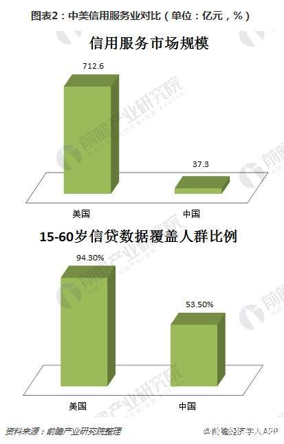 而美国信用服务市场规模已达712.6亿元,差距相当明显。在数据覆盖方面,15-60岁的年龄层中,中国信贷数据覆盖比例为53.5%,而美国则超过94%,同样远远落后于美国。