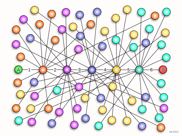 美国心理学家提出了一个六度分离理论。指的是 ‘’你和任何一个陌生人之间所间隔的人不会超过五个(100的6次方就是一百亿),也就是说,最多通过五个人你就能够认识任何一个陌生人。”根据这个理论,你和世界上的任何一个人之间只隔着五个人,不管对方在哪个国家,属哪类人种,是哪种肤色。