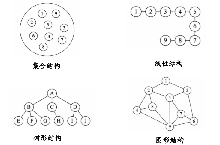 数据与数据之间的联系被称为数据的逻辑结构 ,根据关系的紧密程度,逻辑结构被分为四种