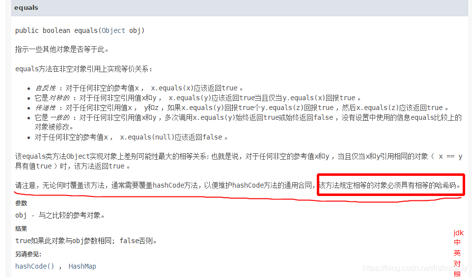1、为了符合规定,看jdk的api(下图),相等的对象必须具有相等的哈希码(补充:对象的哈希码相等但对象不一定相等)。
