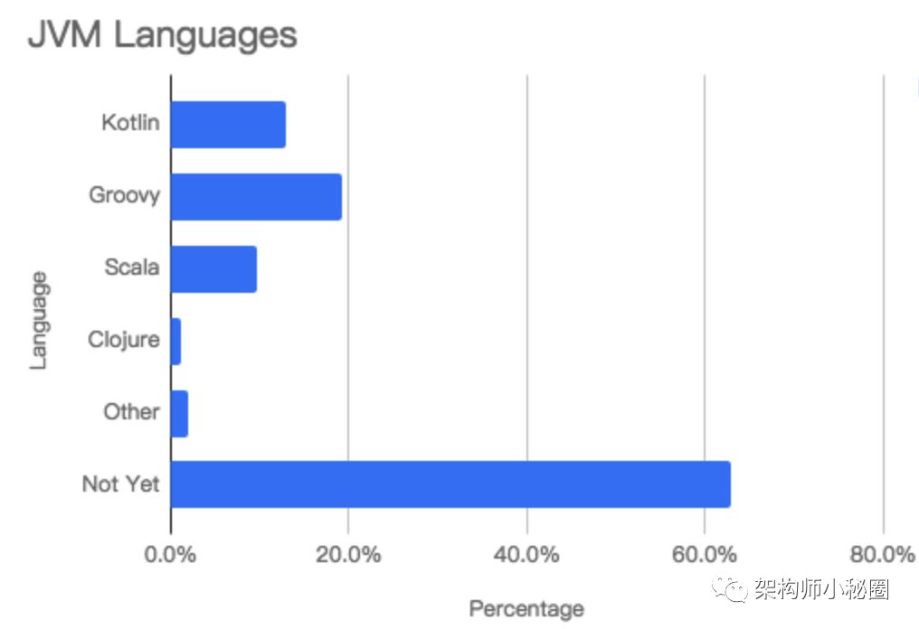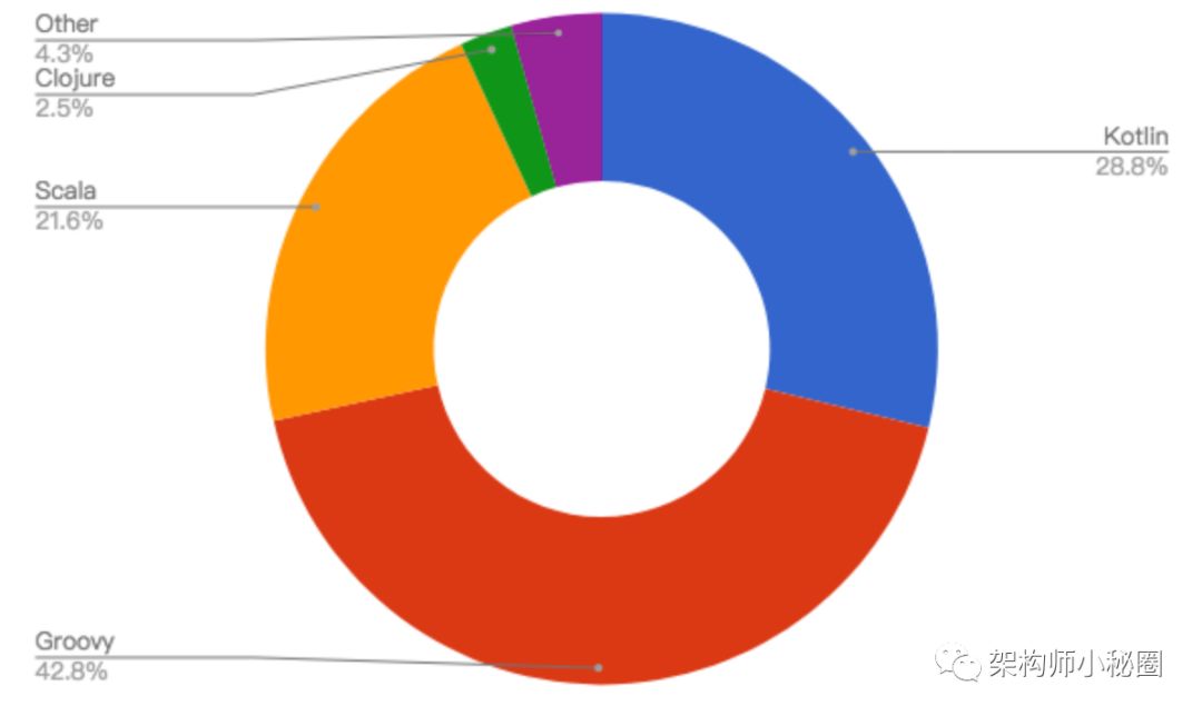 对剩余的JVM语言,画一个饼状图,不得不提Kotlin--这是一个疯狂的一年,从2017年的11.4跃升至今天的28.8%