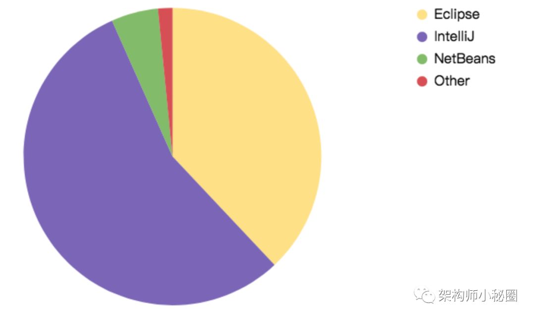 IntelliJ Idea由去年的45.8%增长到今天的55.4%,显然赢得了今年Java领域的IDE王者之战。