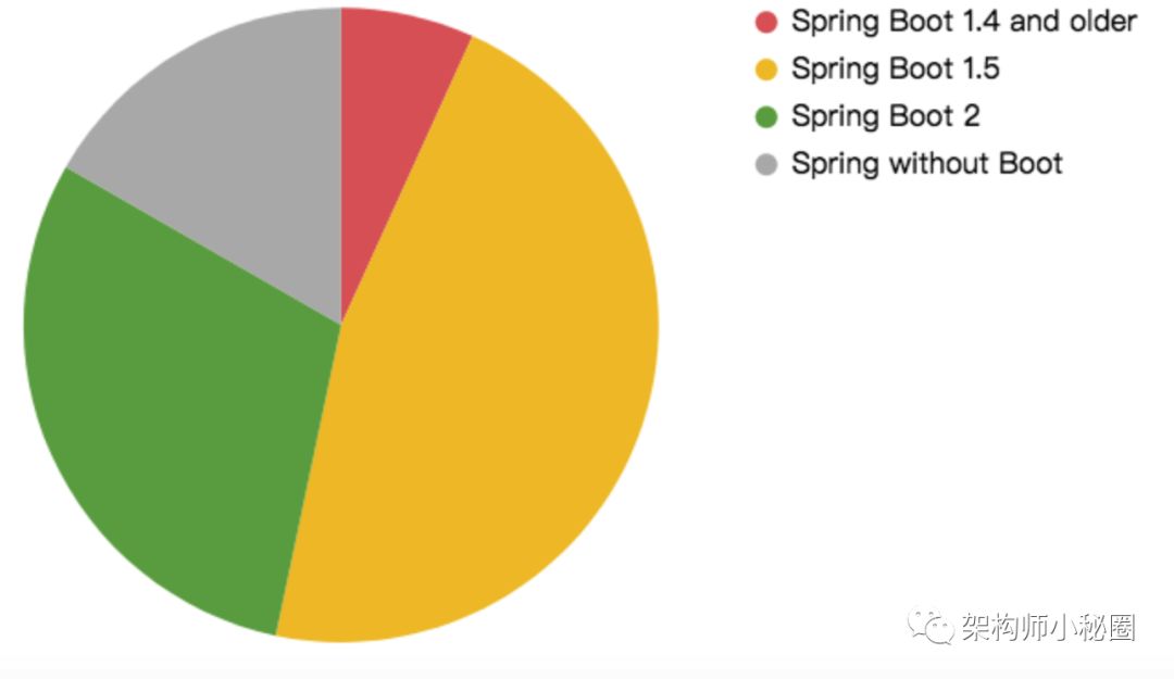 Spring Boot 2的占比上升很迅速,已经占到了百分之30!Boot 1.4以及更老的版本由去年的百分之30降为百分之6.8。