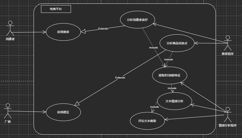 从需求分析中不难得出,此次工程实践所服务的目标人群是消费者和厂商企业,主要是消费者。这样就总结出推荐程序所应该包括的功能,推荐程序的工作都是要建立在情感分析程序的基础上。情感分析,首先要获得训练的样本,之后才能训练模型,模型最后用于实践。