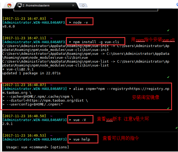 淘宝镜像安装成功后可以用cnpm安装vue-cli如下图: