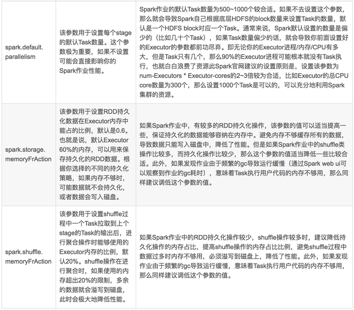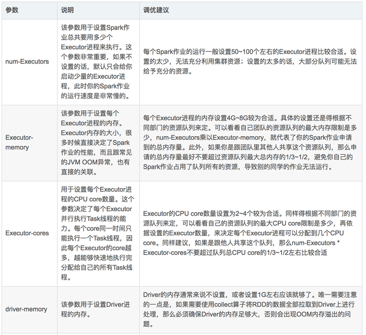 资源参数的调优,没有一个固定的值,需要根据自己的实际情况(包括Spark作业中的shuffle操作数量、RDD持久化操作数量以及Spark web ui中显示的作业gc情况),同时参考本篇文章中给出的原理以及调优建议,合理地设置上述参数。