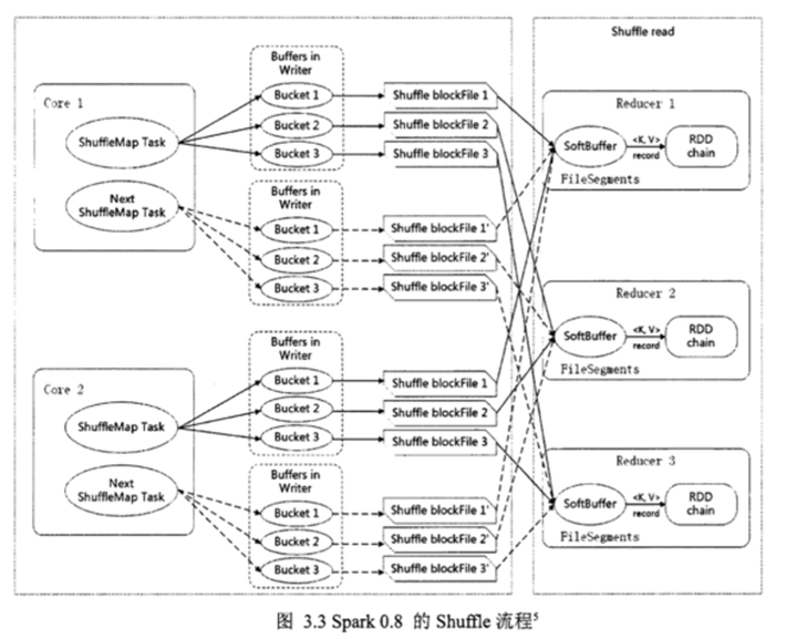 宽依赖主要有两个过程: shuffle write 和 shuffle fetch. 类似 Hadoop 的 Map 和 Reduce 阶段.shuffle write 将 ShuffleMapTask 任务产生的中间结果缓存到内存中, shuffle fetch 获得 ShuffleMapTask 缓存的中间结果进行 ShuffleReduceTask 计算,这个过程容易造成OutOfMemory.