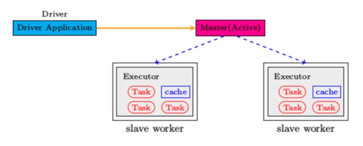 - 执行单元(Executor): 是为某Application运行在Worker Node上的一个进程,该进程负责运行Task,并且负责将数据存在内存或者磁盘上,每个Application都有各自独立的Executors;