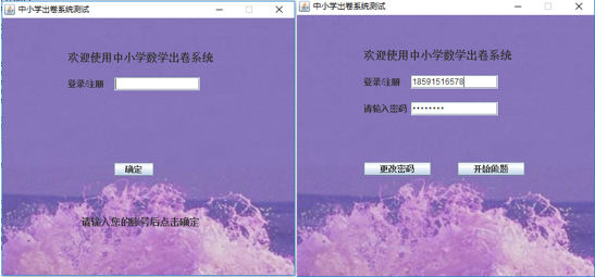 1、登录密码功能,这个功能使用了两个java文件来实现,使用了阿里云提供的jar包来实现。手机号与密码设置均存在txt文件中。初始界面如下图所示,用户账号默认为手机号码,在输入手机号之后将会进行检测,若该账号已被注册则会弹出密码输入框,成功登录后跳到修改密码/开始出题的界面。若没有注册过则会出现验证码的输入框然后是设置密码。