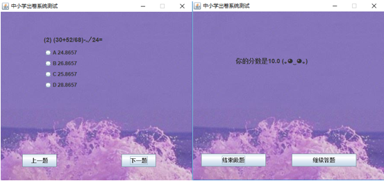 4、ui界面的展示其实在每个java文件中都有体现,除了出题计算,发送验证码这两个纯功能的文件除外。一开始只是把frame设置了背景图片,后来发现会被上面的单选框,panel页面遮住于是设置了他们的透明,结果发现在上下题切换上又出现了新的bug,文字重叠在了一起。这就涉及到了panel的重叠问题,他会默认显示第一个panel界面,但由于设置了panel的透明化,于是那些被压在下面的也显示了,因此要将显示关闭。