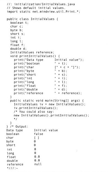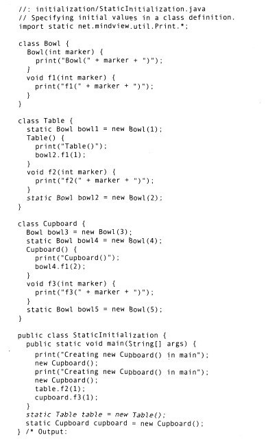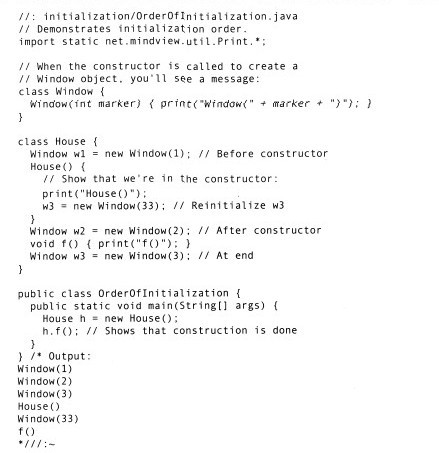 在类的内部,变量定义的先后顺序决定了初始化的顺序。即使变量定义散布于方法定义之间,它们仍旧会在任何方法(包括构造器)被调用之前得到初始化。例如: