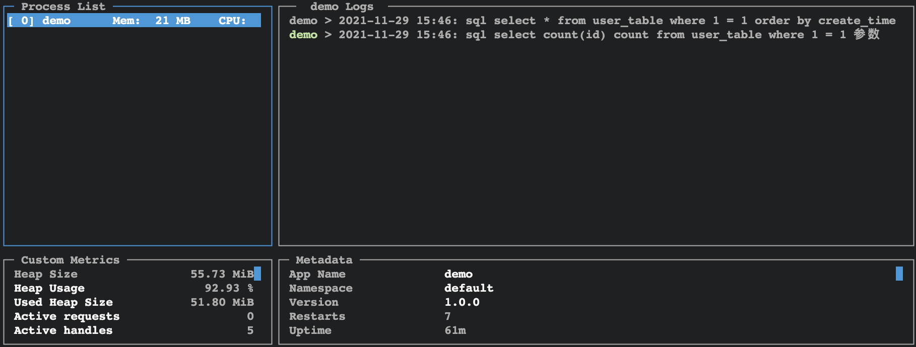 Process List:表示进程列表 | demo Logs:log日志 | Custom Metrics:自定义指标 | Metadata:元数据【基本信息】