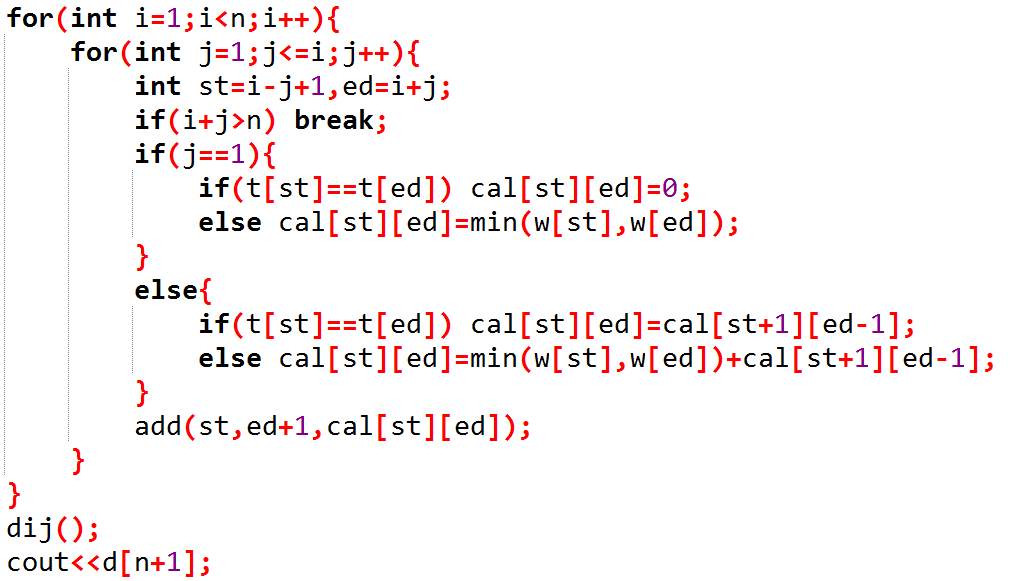 else cost[l][r]=get_cost(l+1,r-1)+min(w[l],w[r]);//
