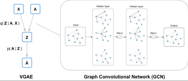 1.GCNModelVAE(src/vgae):图卷积自编码和变分图卷积自编码(config中可配置使用自编码或变分自编码),利用gae/vgae作为编码器,InnerProductDecoder作解码器。 Variational Graph Auto-Encoders 。