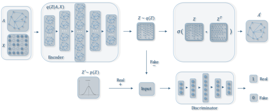 2.GCNModelARGA(src/arga):对抗正则化图自编码,利用gae/vgae作为生成器;一个三层前馈网络作判别器。 Adversarially Regularized Graph Autoencoder for Graph Embedding 。