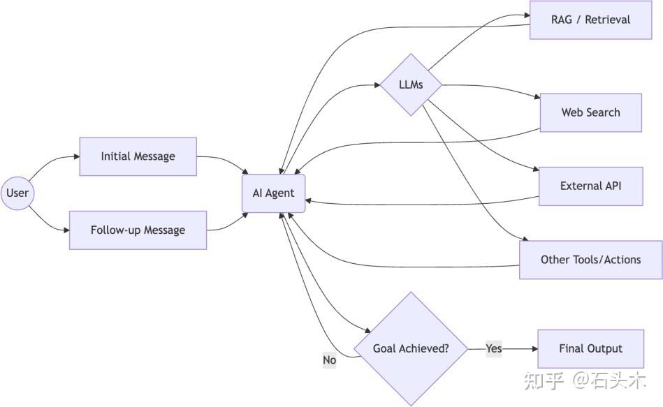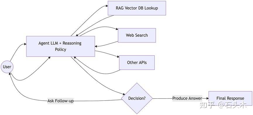 图:具有自治代理的代理 RAG 体系结构。代理(一个具有推理策略的 LLM)接收用户的输入并给出指令,该指令在非线性工作流中采取多个动作。在这个示例中,代理可以使用诸如 RAG(向量数据库查找)、web 搜索或其他 api 之类的工具。在生成答案之前,它可能会执行几个工具调用(甚至组合结果)。如果需要,代理还可以决定向用户提出后续问题(使交互成为会话)。这个灵活的循环会一直持续下去,直到代理确信它可以回答这个问题。将此与前面的单通道图进行对比—这里代理有效地将反馈循环和决策分支插入到 RAG 管道中。