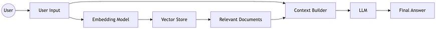 图:一个典型的标准RAG 管道。用户的查询由嵌入模型嵌入,该模型用于从向量数据库中检索相关文档。检索到的上下文与查询相结合(在上下文构建器和提示下)并传递给 LLM 以生成最终答案。这个管道是一个单遍的线性流程,不涉及任何迭代推理。