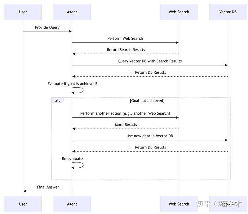 在上图中,代理甚至可以按顺序执行多个操作(例如,执行 web 搜索,然后将这些结果提供给向量 DB 查询),并在必要时重复。这证明了代理 RAG 的非线性、自主工作流程的特点。