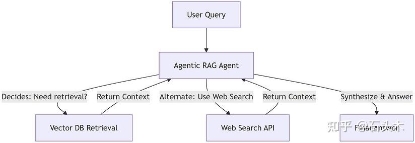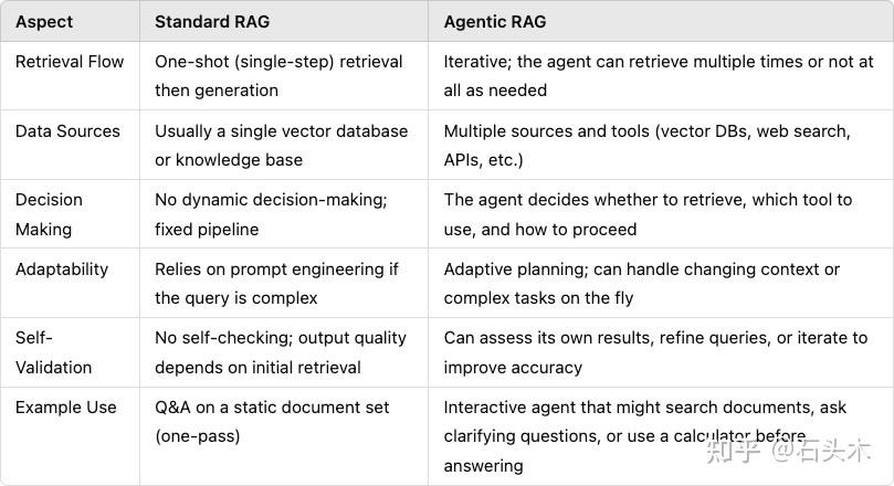 工具,并使用类似“标准 RAG 和代理RAG 之间的差异”这样的公式查询。如果这里的知识库有一篇文章(比如这个博客或相关文档)被索引,向量搜索可能会返回一个列举这些差异的段落。代理将读取结果(ReAct 中的 Observation),然后继续。由于这个查询是直接请求差异,单个检索可能就足够了,然后代理将生成一个列出差异的答案(可能引用它看到的上下文)。如果问题更复杂,代理也