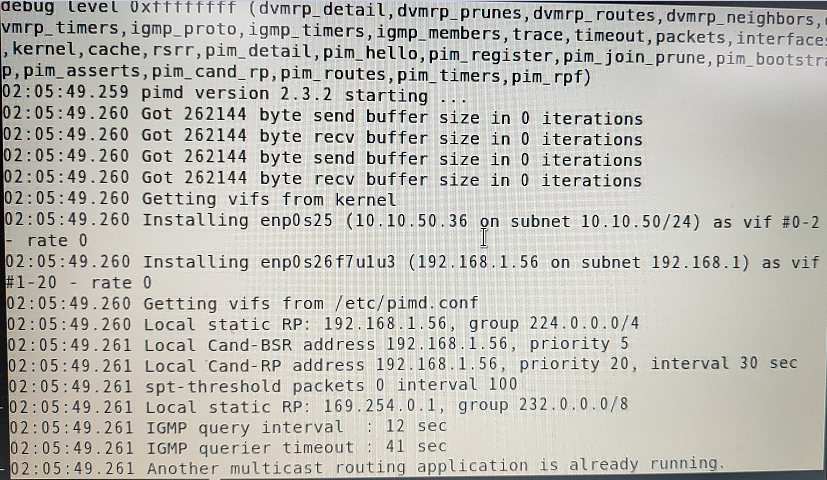 值得注意的是pimd -d命令是一直运行的,如果想使用终端建议再新开一个窗口,不要ctrl+c退出。最早我是犯过这个错误的,以为pimd就在后台运行了,这个只是个调试信息中断没有关系。