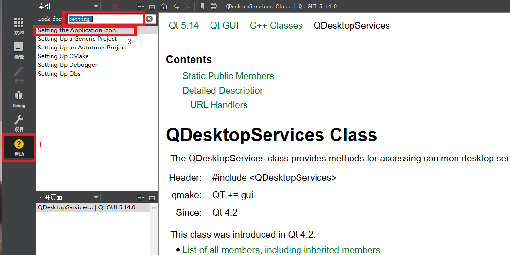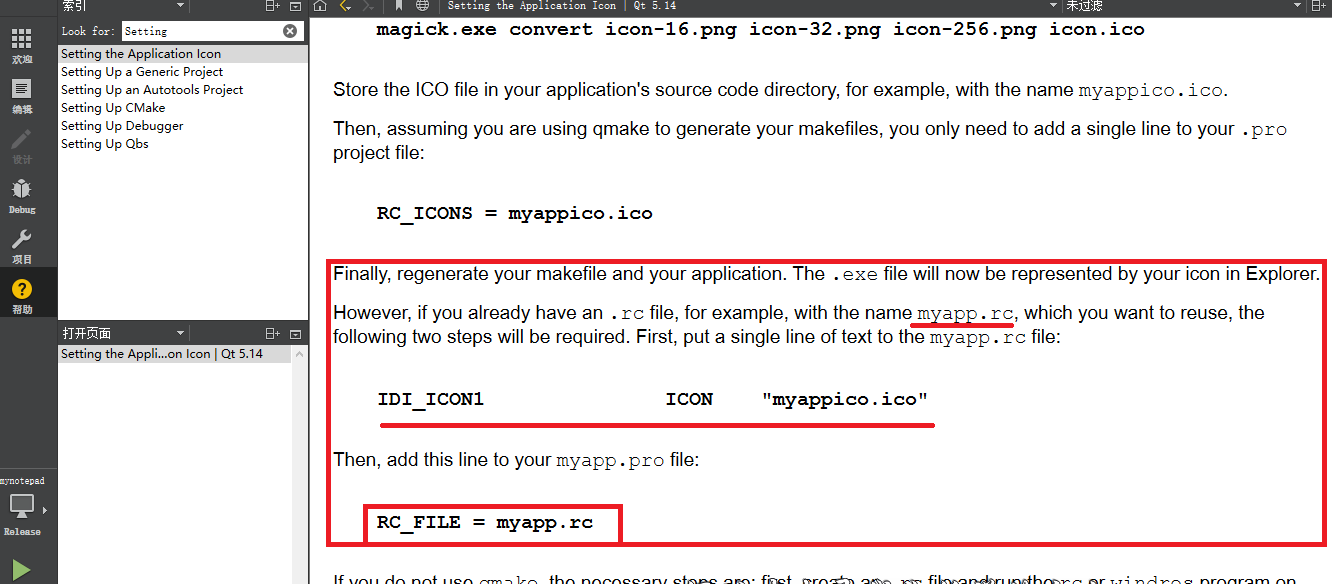 打开Qt,选择帮助选项,搜索Setting,选择第一个搜索结果Setting the Application Icon,双击打开