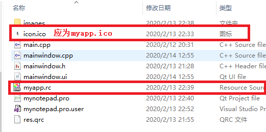 将准备好的图标文件放myapp.ico到Qt的工程目录下,在创建一个新的文本文档并重命名为myapp.rc,如下图