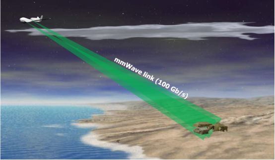 美国国防先进研究计划局(DARPA)的无线数据通信专家们正在想业界发出开发一种基于无线电频率通道、每秒传输数据达100Gbit的军用数据链的请求。该系统将用于作用距离为125英里(200公里)、每秒100Gbit传输速率的空空数据链的应用,和飞行高度约60000英尺(18288米)的飞机上作用距离为62英里(100公里)的空地数据链的应用。日前,DARPA和诺格公司联合发布报道,双方联合开展的项目已经于2018年1月份在洛杉矶的城市环境中进行了20公里视距范围内传输速率高达100bps,并可以在9Gbps-101Gbps的速率范围进行自适应传输的试验。此项试验同样是在E波段利用连续的5GHz频段,采用高效率调制技术和空间/极化复用技术实现如此高速度的信息共享。
