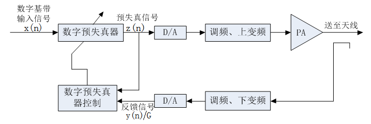 当发送端功率放大器工作在饱和或近饱和状态时,而调制信号的幅度携带信息(如QAM调制、OFDM调制等)时,会对其处理的信号造成较大的非线性失真,这种失真将直接影响到解调之后的信号质量,严重时甚至无法完成解调。一个简单的方法是使功率放大器回退工作在线性区,然而这会极大的降低功率放大器的效率,造成能量的损失。为了减小这种失真,一种办法是在接收端使用非线性均衡器来事后校正,另一种办法是在发送端的调制器中加入预失真模块,对数据实施与放大器非线性特性相反的操作,从源头来减小放大器输出信号的非线性失真。当然,最好是在发送端和接收端都进行非线性失真的校正处理,这样获得的信号将更贴近原来发送的信号。数字预失真系统的结构如下图所示: