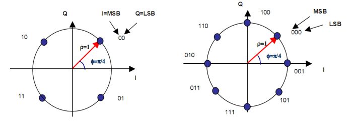 QPSK和8PSK是卫星广播通信中传统的调制方式,它们近似恒包络调制,对卫星转发器的线性程度要求很低,可以工作在接近饱和的状态,功率利用率非常高,这点对卫星上的通信设备有效载荷非常关键。它们的星座图如下。