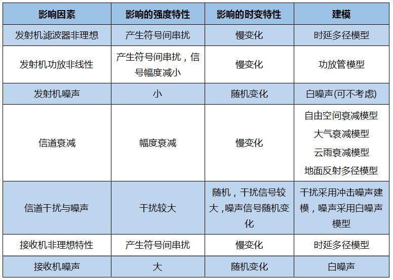 其中,Hs表示发射机导致的信号衰减和畸变作用因子,Hc表示大气、云雨和地面反射等导致的信道衰减和衰落作用因子,HR表示接收滤波器非理想特性,如群延时特性等。nS表示发射机产生的噪声,nC表示信道产生的干扰和噪声,nR表示接收机产生的电子热噪声。