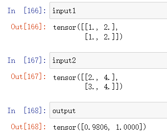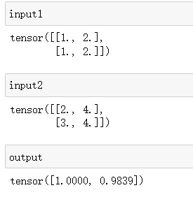 (dim=1)计算流程是:(1*2+2*4)/根号(1的平方+2的平方)/根号(2的平方+4的平方)=10/根号5/根号20=1,另外一个输出计算方式一样;