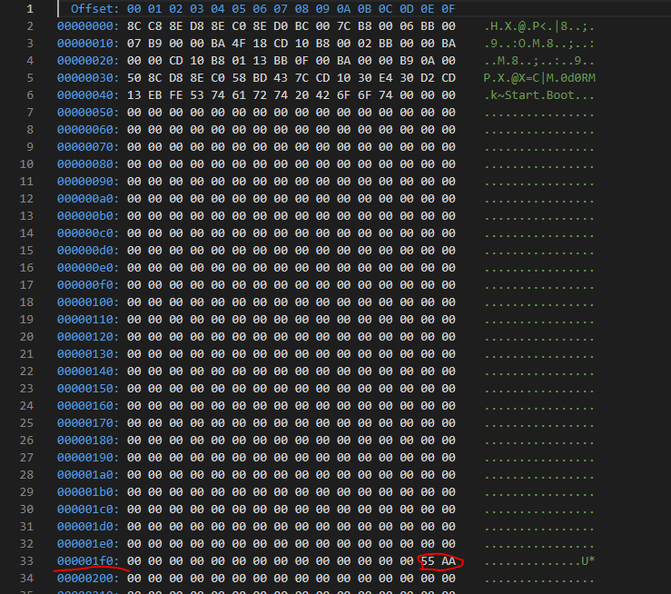; 扇区剩下的字节全部填满0(除了最后两个字节)