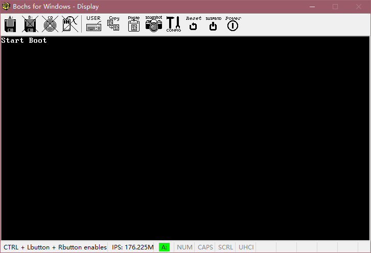 首先在终端中输入bochs(需要配置环境变量,或者能调用得到bochs.exe):