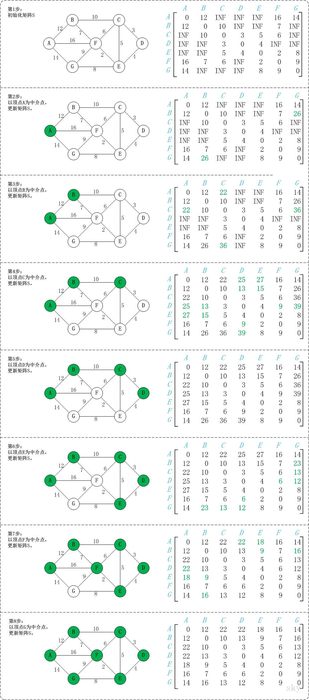 它通过3重循环,k为中转点,v为起点,w为终点,循环比较D[v][w] 和 D[v][k] + D[k][w] 最小值,如果D[v][k] + D[k][w] 为更小值,则把D[v][k] + D[k][w] 覆盖保存在D[v][w]中。