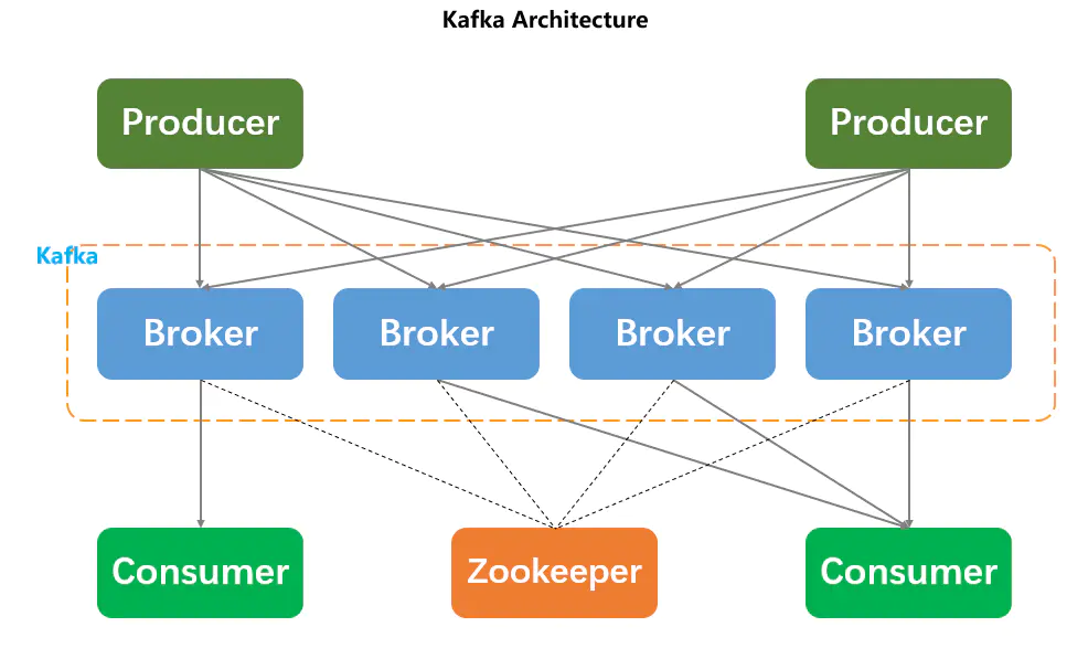 如下图,一个 Kafka 架构包含若干个 Producer,若干个 Consumer,若干个 Broker 和一个 Zookeeper 集群。