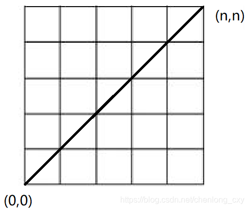 简单来说,卡特兰数就是一个有规律的数列,在坐标图中可以表示为:从原点\((0,0)\)出发,每次向\(x\)轴或者\(y\)轴正方向移动\(1\)个单位,直到到达\((n,n)\)点,且在移动过程中不越过第一象限平分线的移动方案总数。