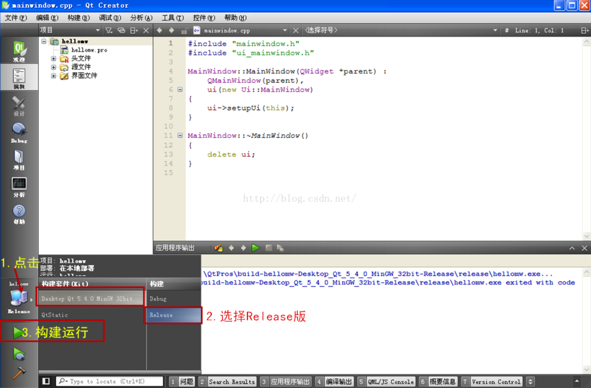 1)首先用 QtCreator 新建一个 Qt Widgets Application 项目,直接用默认的 QMainWindow 程序就可以了,项目名字假定是 hellomw。