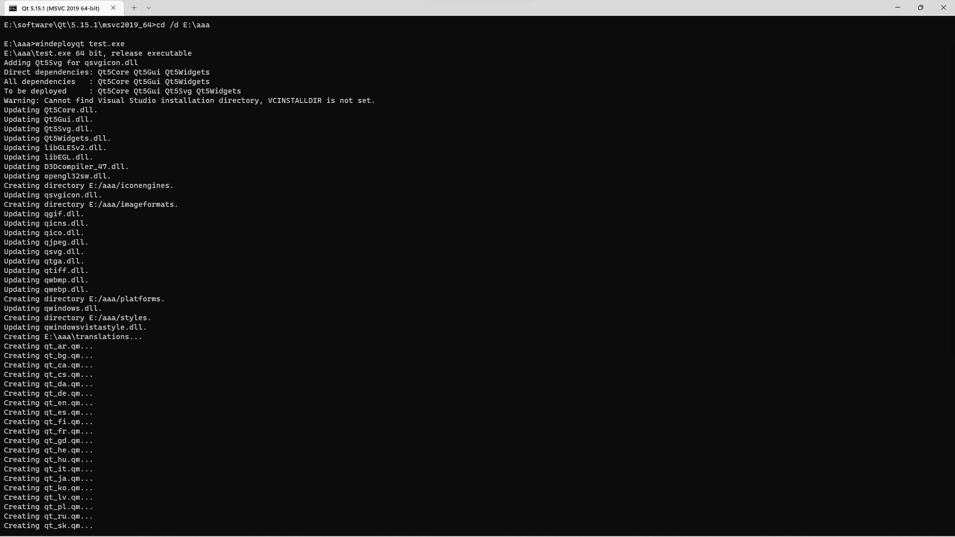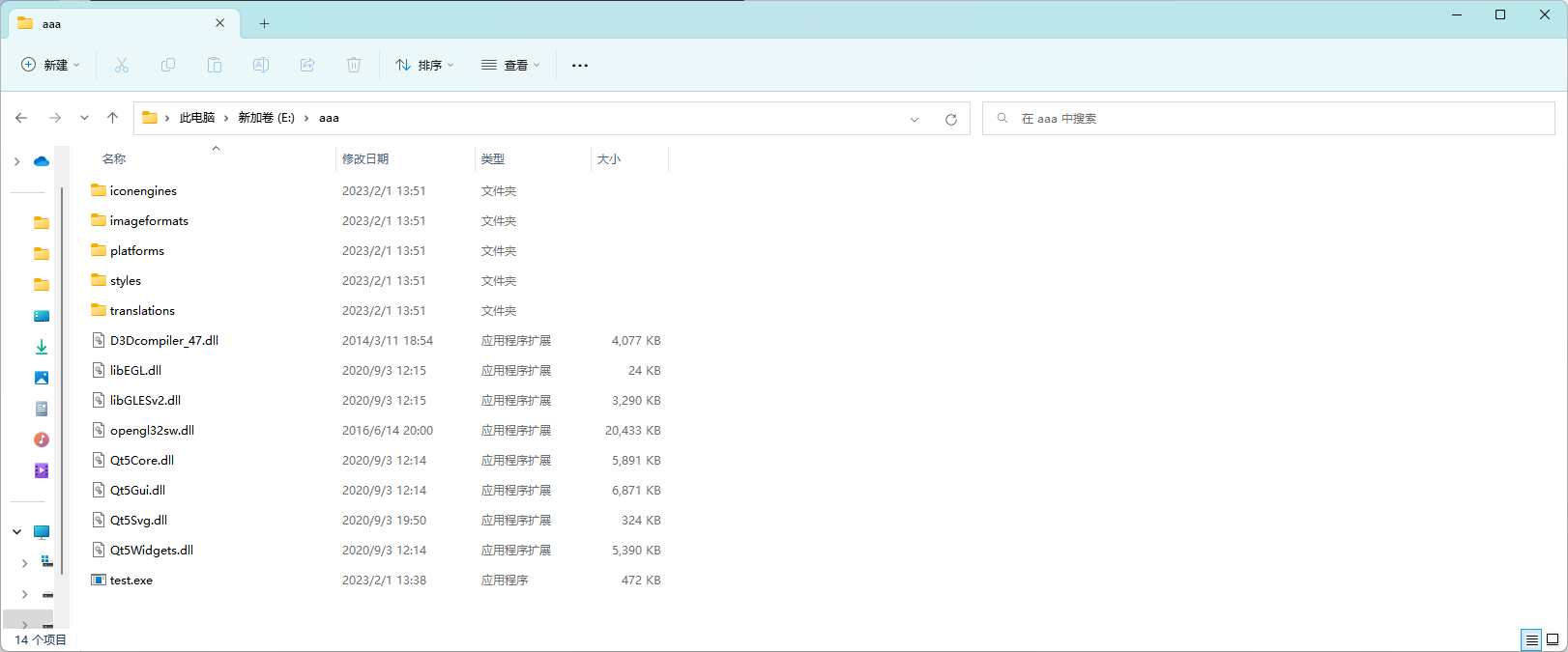 然后可以在 E:\aaa 文件夹里看到 windeployqt 工具自动复制的插件文件夹和 dll文件、qm文件。这时候得到的就完整的 exe 程序发布集合,依赖关系都解决好了。