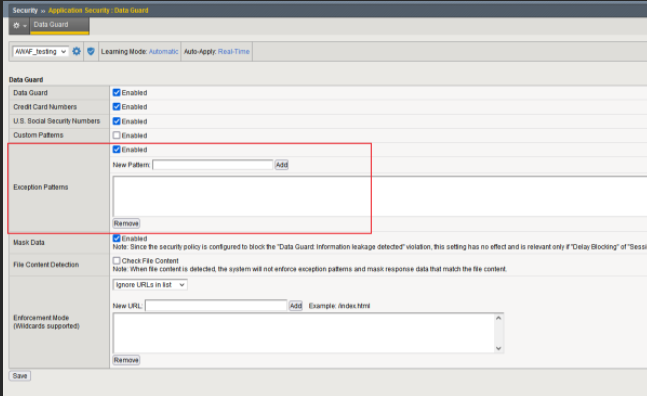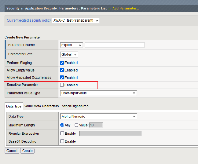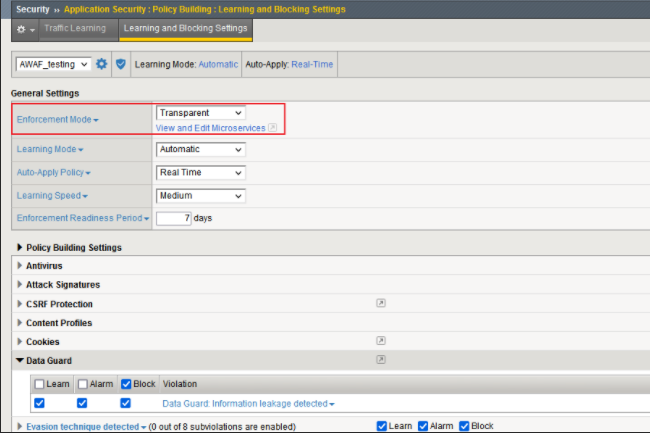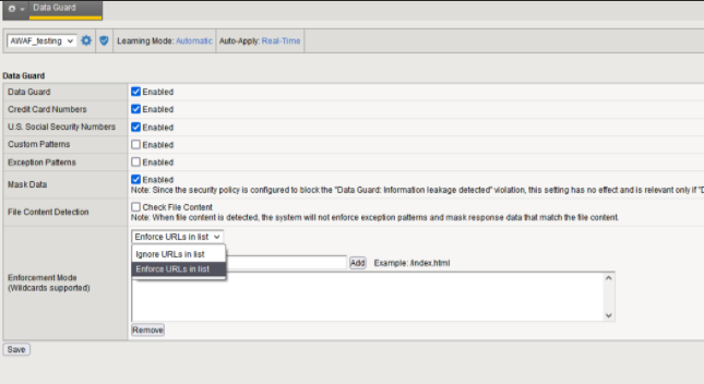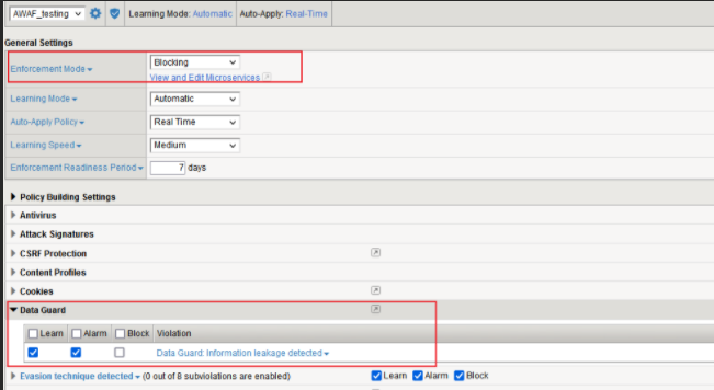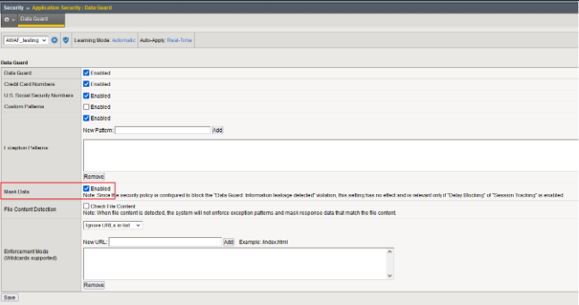AWAF也可以对敏感信息进行加密,只有在Policy是Transparent或者是Bolcking但是Data Guard是Alarm/Learn的时候才会加密,加密的形式是*,并且需要勾选Mask Data