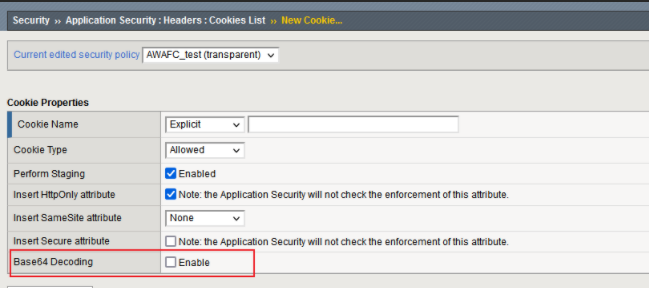 您可以启用安全策略来检查 cookie 值是否包含 Base64 编码的字符串。如果该值确实是 Base64 编码的,则系统会解码该值并继续进行安全检查。 指定启用时安全策略检查 cookie 的 Base64 编码值,并解码该值。默认设置为禁用。