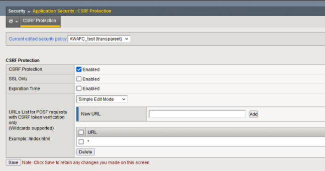 AWAF can protect against CSRF attacks by appending a token, which has a fixed time to live, in the requested URL.When the resource is requested again, AWAF verifies that the token is valid and present in the URL.