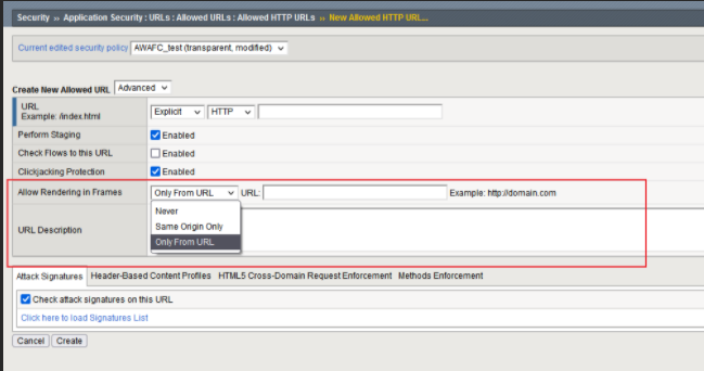 - Only from URL >> Instructs the browser to render the URL only if the origin is the same one that users specify in the address bar. For example, site owners may wish to enable rendering of a protected page within frames, but only for a specific site---指示浏览器只在源代码与用户在地址栏中指定的源代码相同时才呈现 URL。例如,站点所有者可能希望在框架内启用受保护页面的呈现,但仅限于特定站点