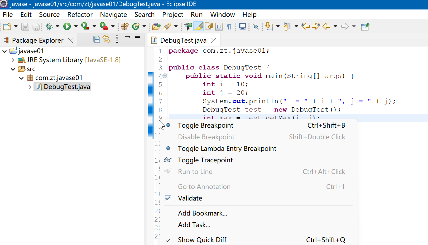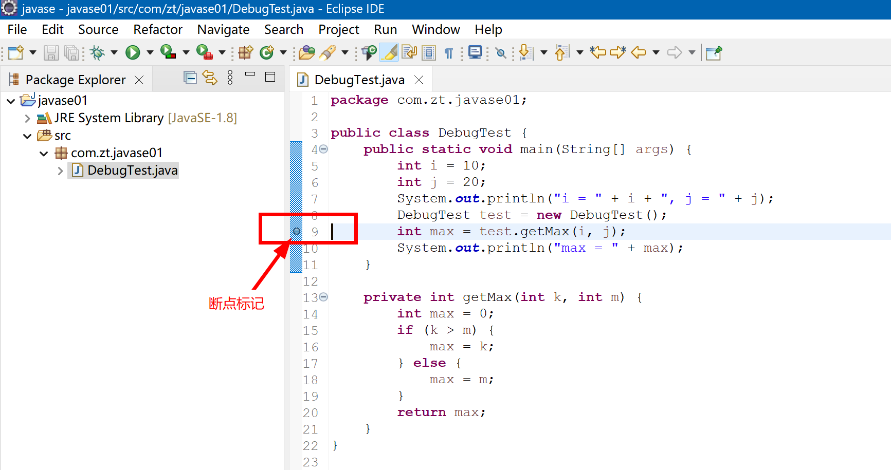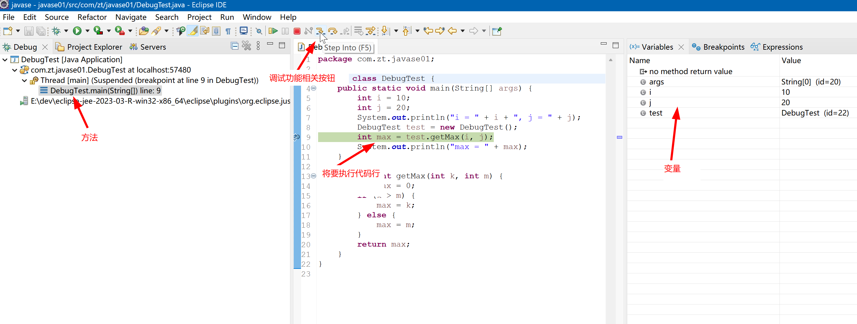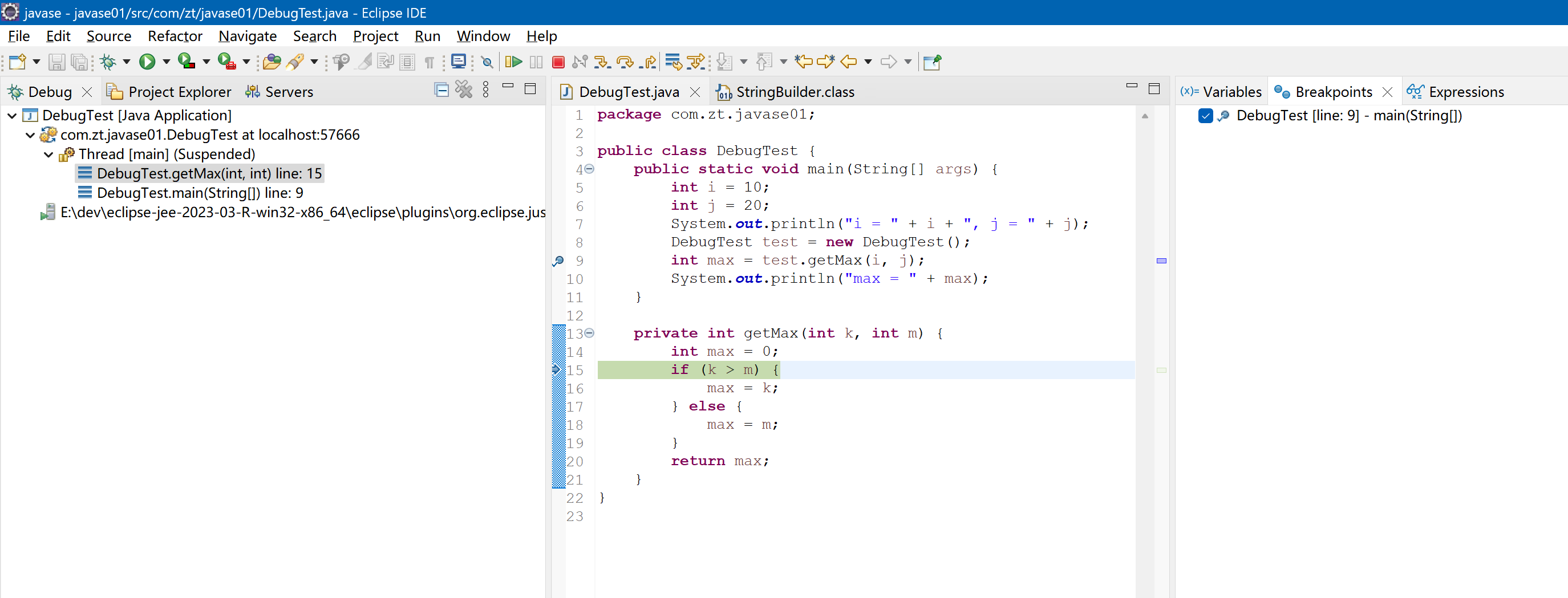 可以看到断点打在第9行代码, eclipse在执行第9行代码前暂停, 在Variables视图可以看到main方法中局部变量i=10, j=20, test为DebugTest类型